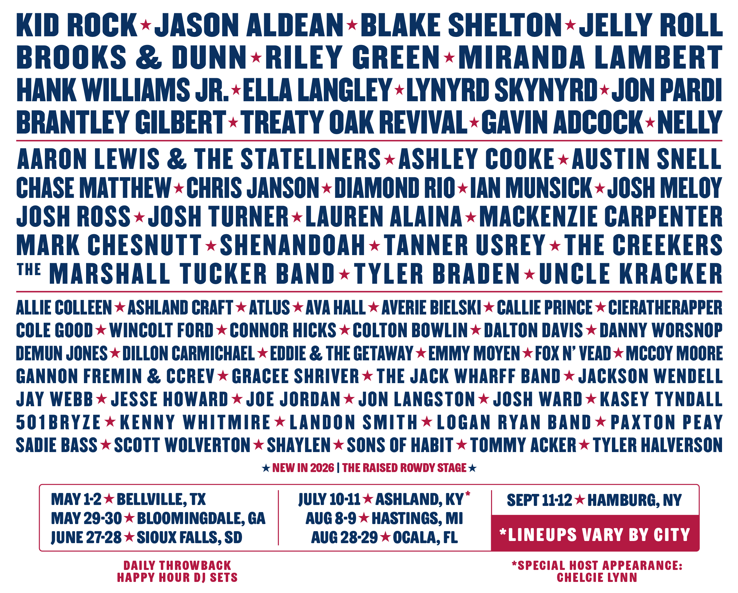Kid Rock · Jason Aldean · Ella Langley · Brantley Gilbert · Aaron Lewis & The Stateliners · Chase Matthew · Shenandoah · Diamond Rio · Josh Meloy · Tanner Usrey · Josh Ward · Logan Ryan Band · Gannon Fremin & CCREV · Jackson Wendell · Grace Shriver · Connor Hicks · Tommy Acker · Callie PriNce